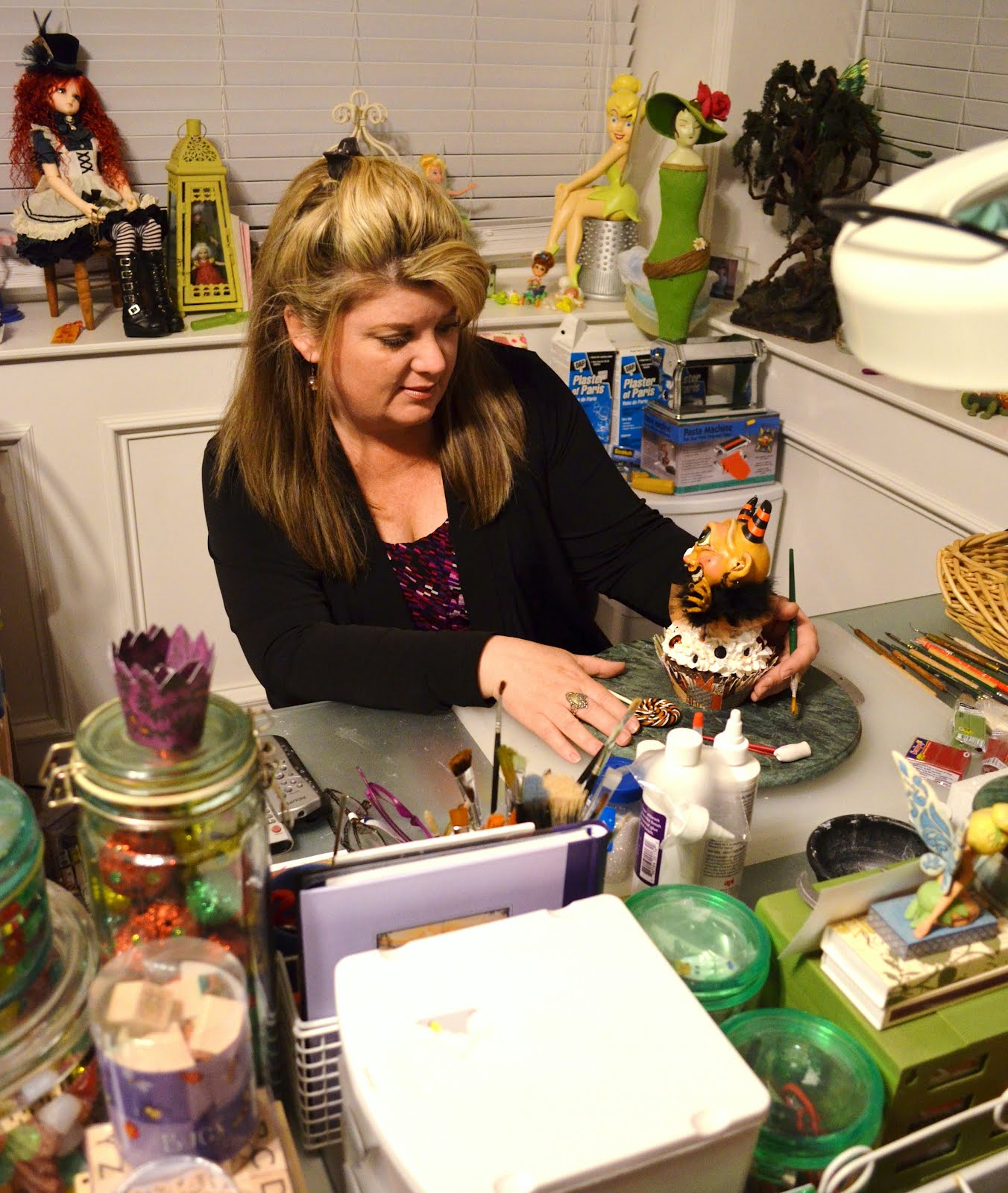 I have a special treat for all you dear friends. A very dear friend and talented artist is joining PFATT Marketplace this month and I get the pleasure of introducing her! Drum Roll…Lee Ann Kress of Charmed Confections! I am sure you will find her artwork Spooktacular. Here is a sneak peek at one o f her creations and a picture of her creating!